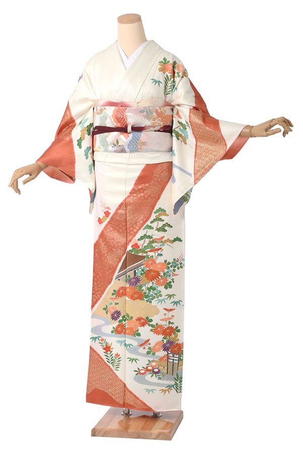 アイボリーと朱色で染め分けた絹地に、松竹梅や菊、羊歯、流水、桔梗、紗綾形などのお柄を描いた訪問着でございます。