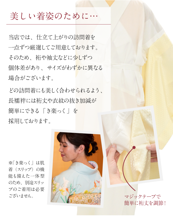 裄丈や衣紋の抜き加減が簡単に調整でき、どなたでも美しくご着用いただけます。