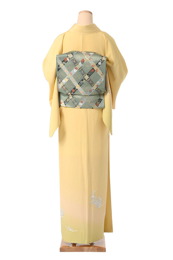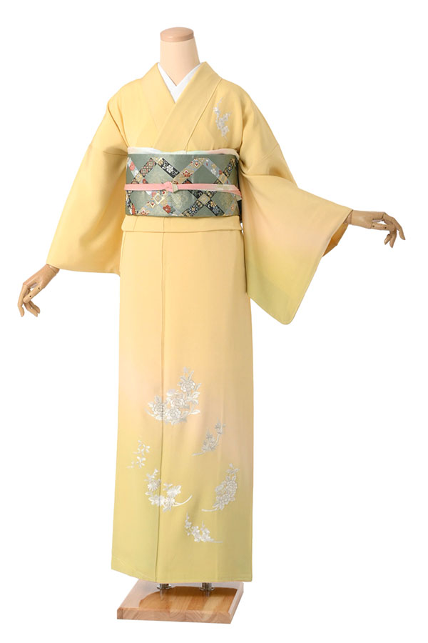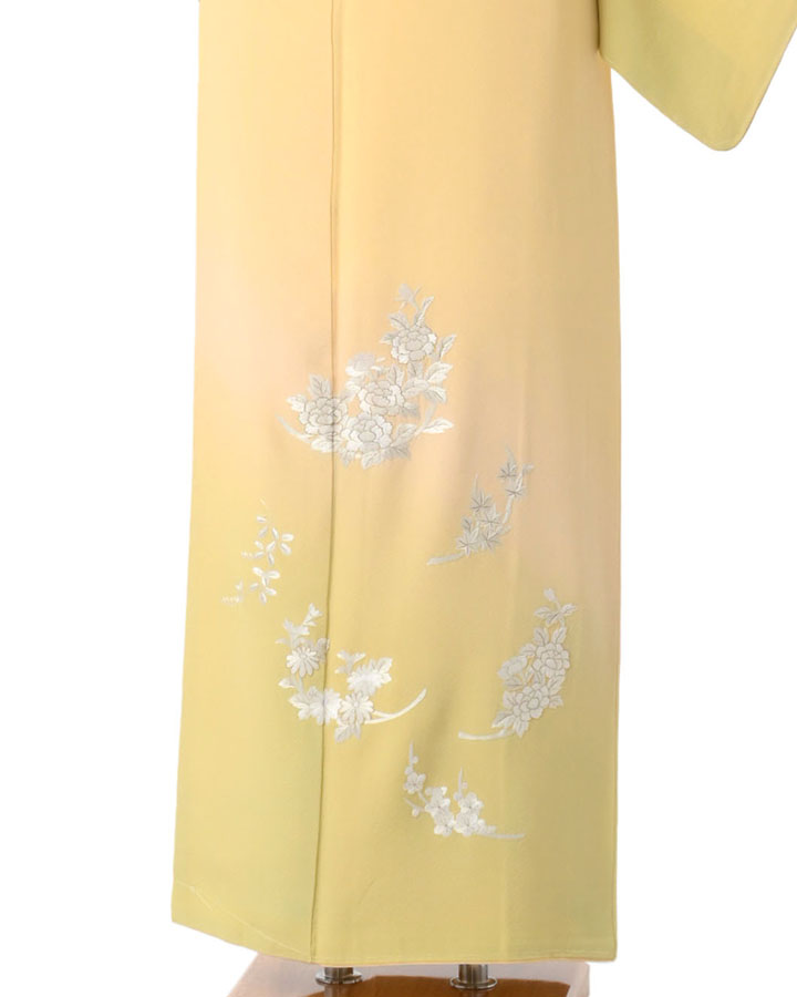 鮮やかな黄色に黄緑色の暈し染めを施した絹地に、牡丹や萩などのお柄を刺繍で施した訪問着でございます。