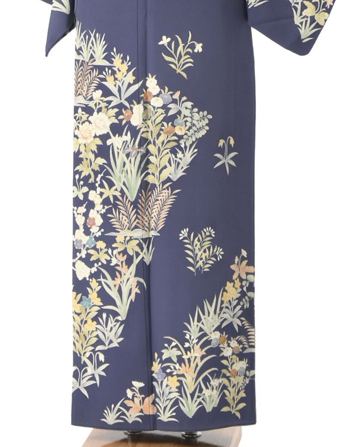 ・訪問着レンタル 裂取草花 紺藍色 Mサイズ D410