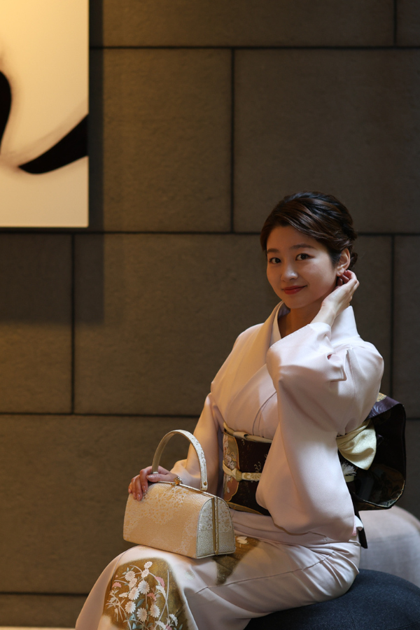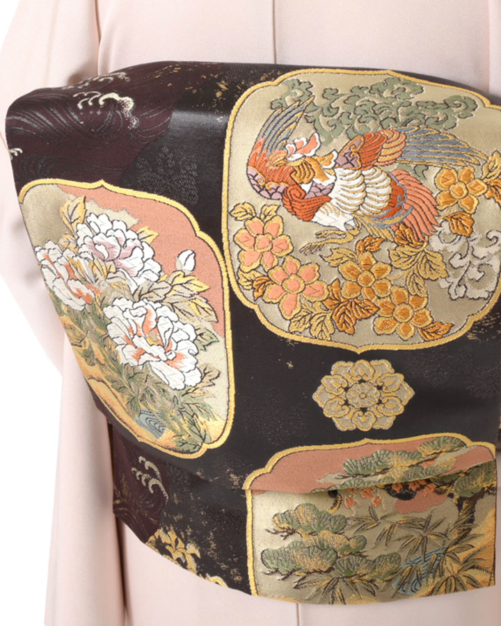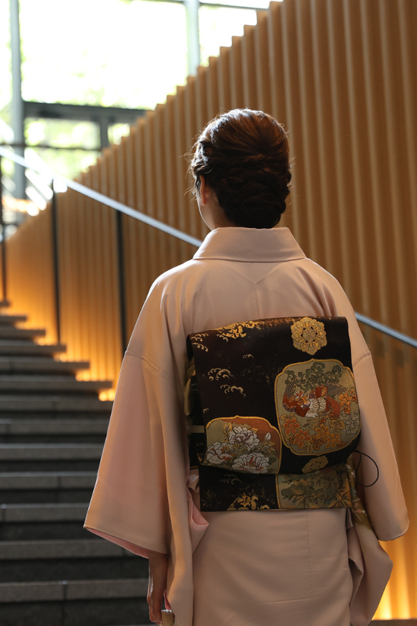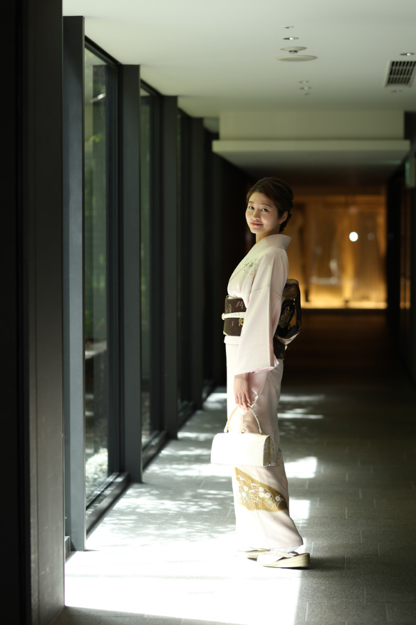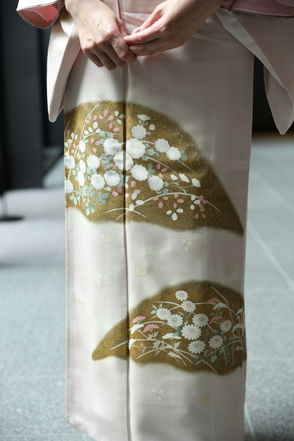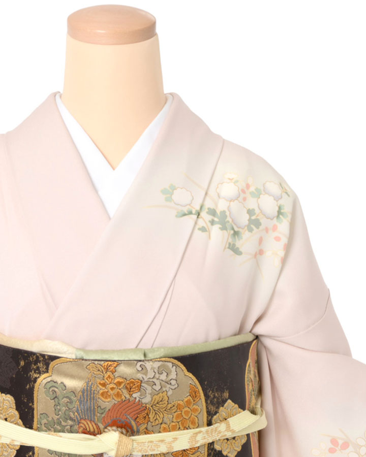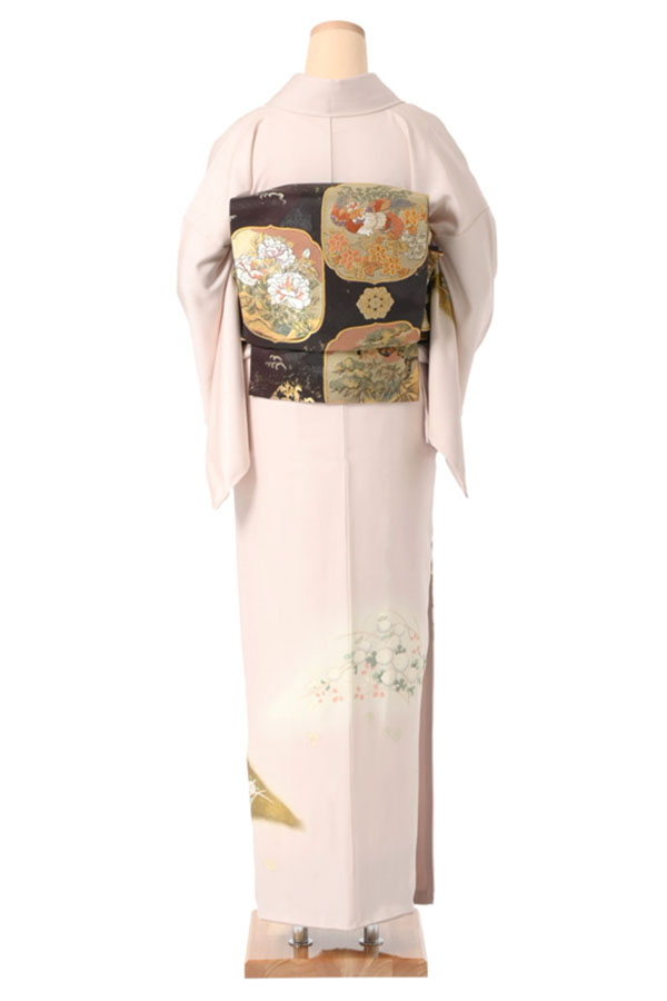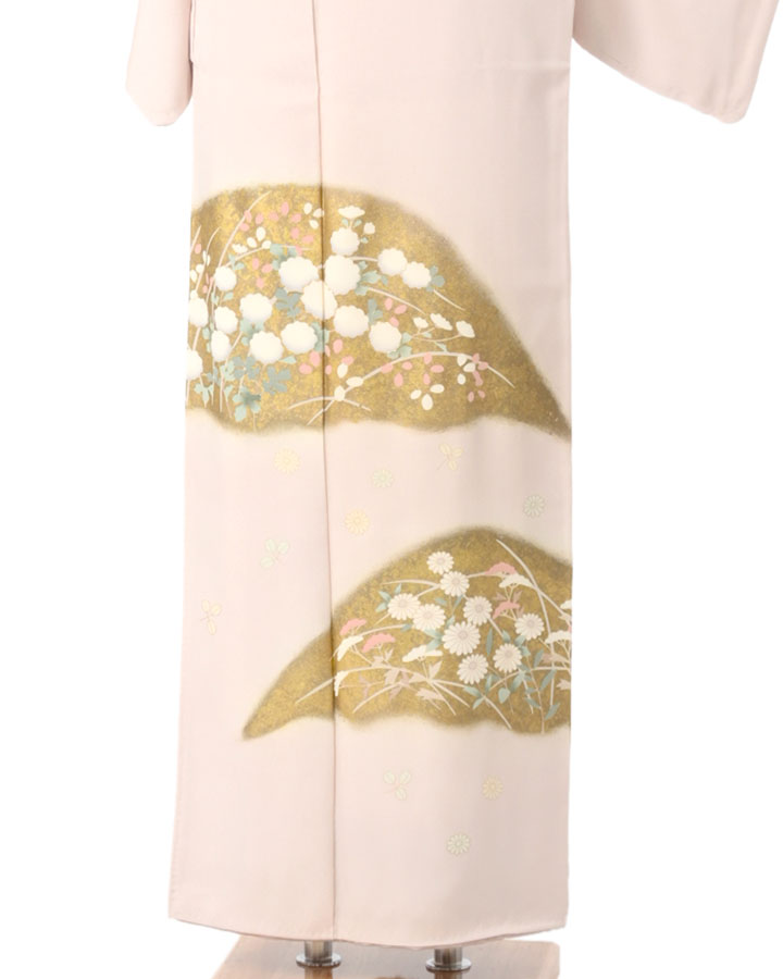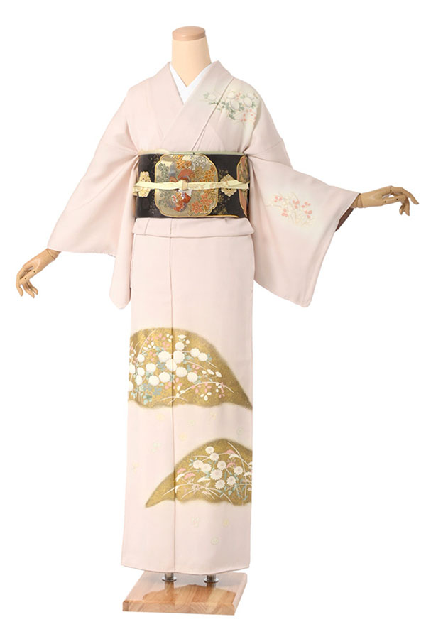優美な桜色に染められた絹地に、菊や萩、女郎花などのお柄が描かれた訪問着でございます。