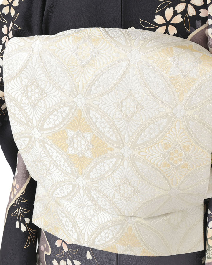 白と金銀糸を込めて七宝模様を込めたフォーマル帯。