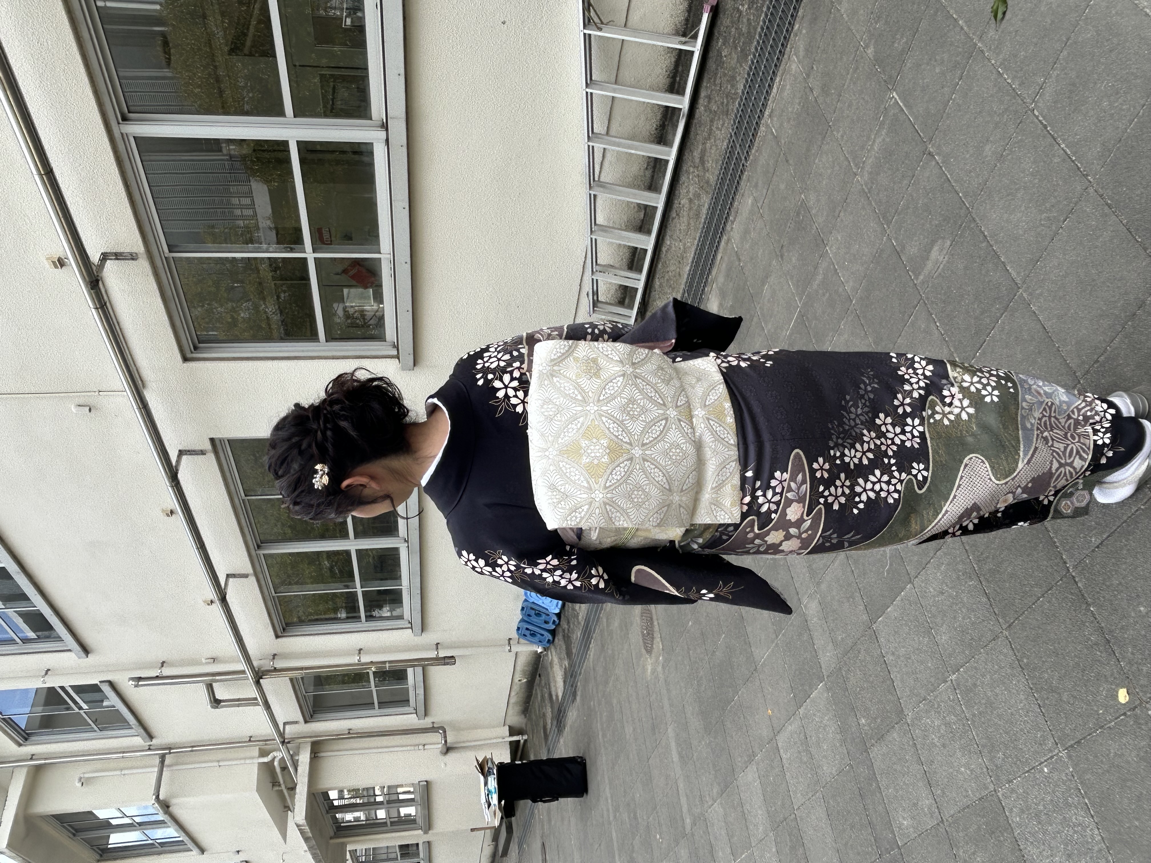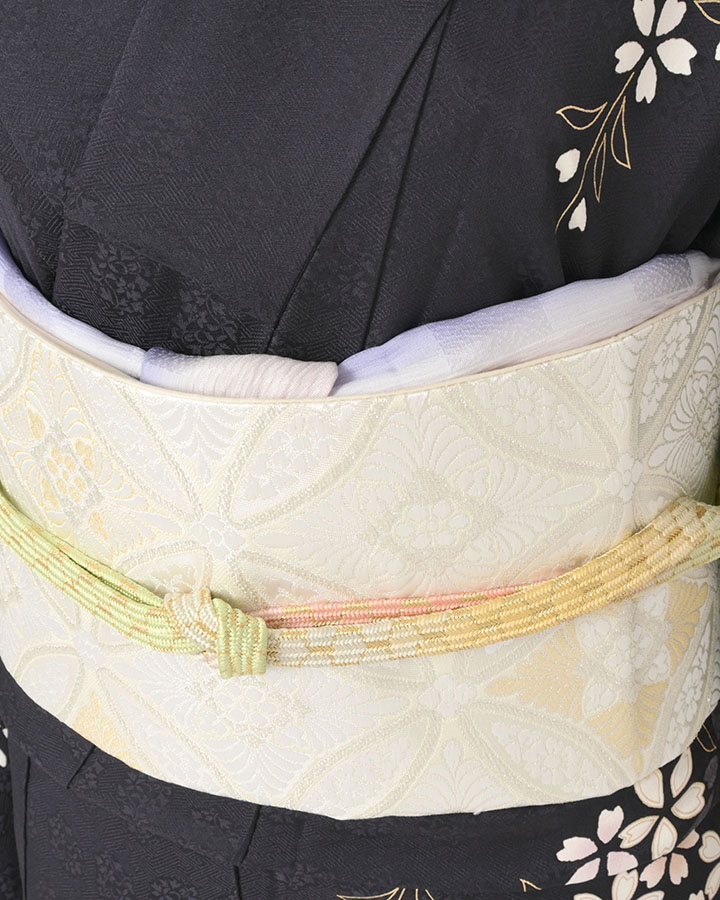 帯締めは若葉色、黄色、桃色と金の組み合わせ、帯揚げは白藤色と紺瑠璃色のぼかしです。